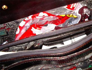 A womens purse is a very mysterious thing. Almost every women I have ever known has owned either a purse or hand bag that contains dozens haphazard items. My mothers purse (the picture above was taken a few years ago) was always a treasure trove for chocolate kisses and Pepperidge Farm cookies… until Jenny Craig recently ruined all of that. My wife’s hand bag is more even mysterious (and less tasty) than my Mom’s… lip gloss, diapers, credit cards, a digital camera, car keys, coupons, wet wipes… it’s a totolly random mix.